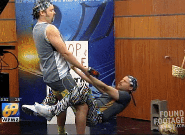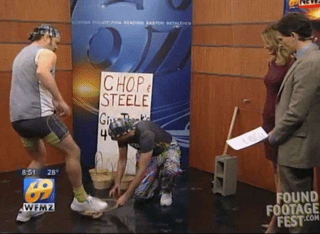 As fictional strongmen “Chop” and “Steele”, they showcased some of their “Feats of Strength”. Below, please dry your eyes after watching these duped morning crews while “Chop” and “Steele” perform by smashing baskets, breaking sticks they found in the parking lot, lift chocolate milk, and assist one standing on their head.