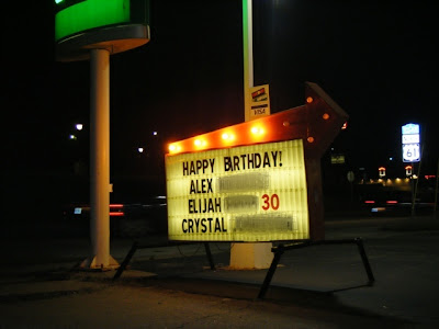 Well look at that, Elijah is turning 30! That’s sweet. Of course, whenver I see these signs I always watch in my rear view mirror to see if they have duplicated the same message on the opposite side.