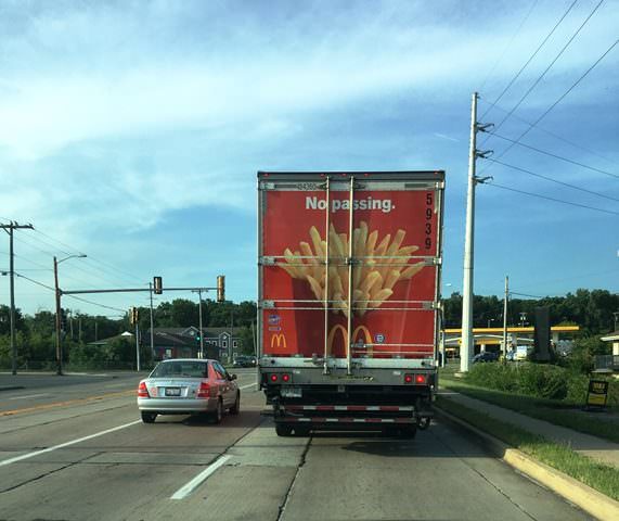I digress, back to my traffic jam. I notice the 18-wheeler in front of me and instead of the typical 1-800-HOW’S MY Driving? I see, “NO PASSING.” “Well, look at me! I’m SOOoo important and I’m going to DEMAND you don’t pass my truck!”