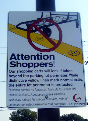 his sign was recently discovered in a Walgreens parking lot. I’m not sure what is more disturbing, the fact that shopping carts get stolen from Walgreens or the fact that they are so valuable that the company has to install an under ground electrical wiring system that renders the cart’s wheels inoperable once said cart goes past the official Walgreens perimeter.