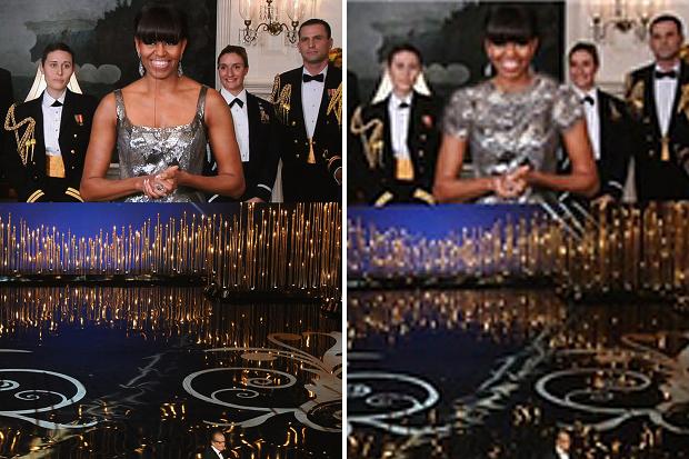 Oh, the picture of Michelle Obama reading the envelope of the Best Picture winner on the left is the uh, original version, and the one on the right is the Iranian version.